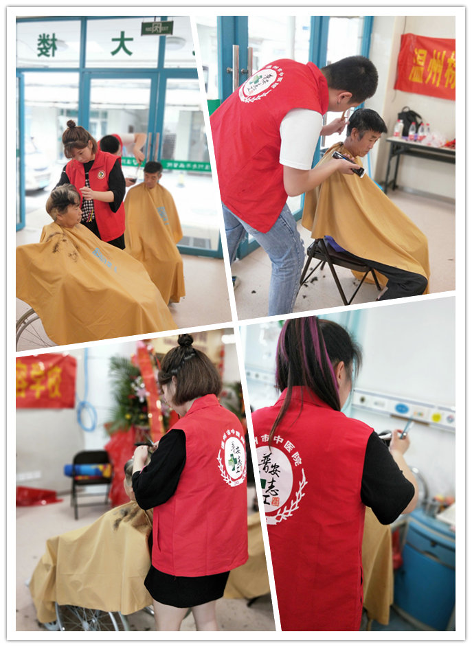 2018年9月5日,我院温州市中医院大士门院区党支部与温州老年病医院党支部联合举办爱心活动,志愿者们在住院部一楼大厅为病区患者免费提供理发服务。