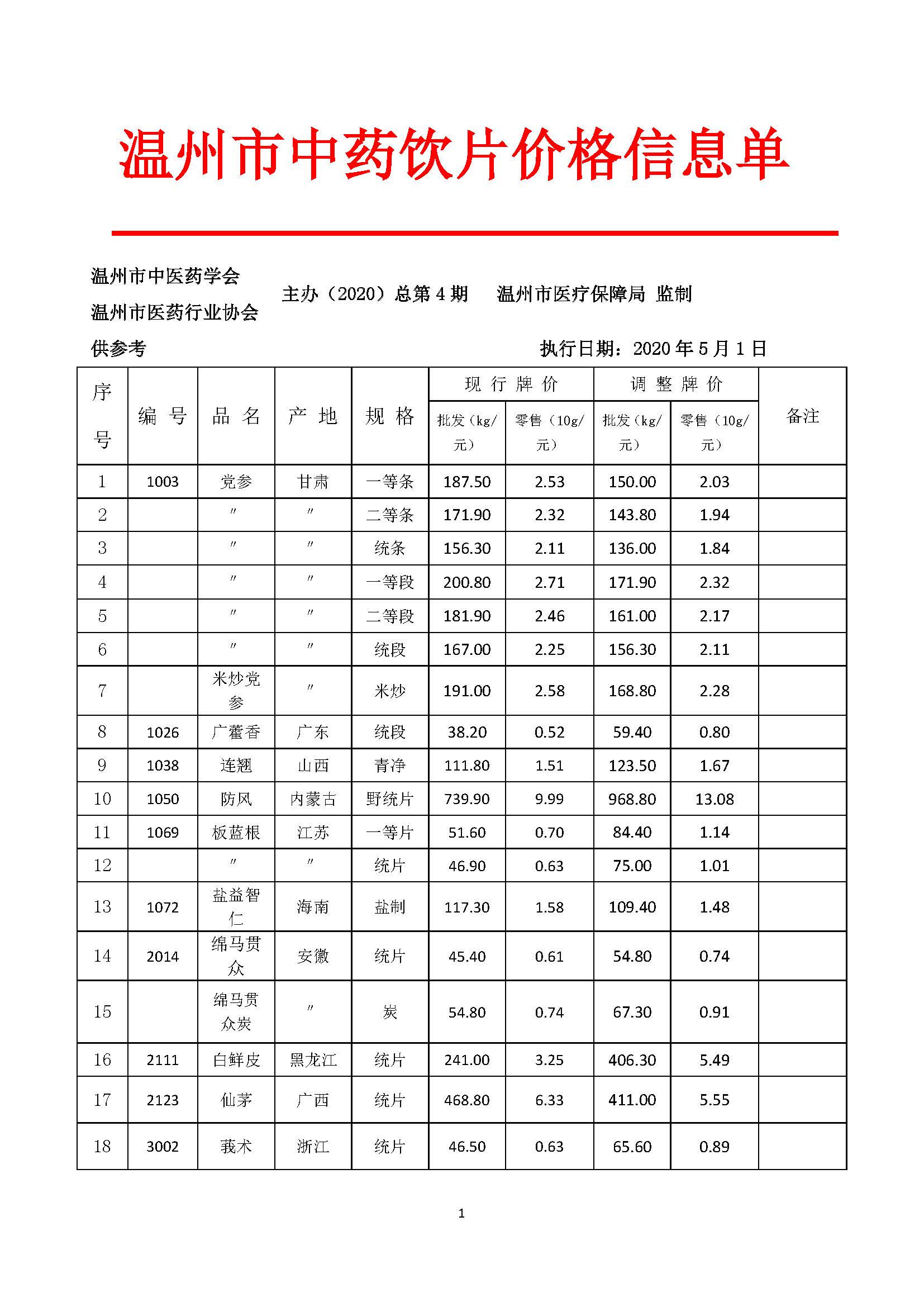 温州市医疗保障局(2020)总第4期《温州市中药饮片价格信息单》自2020年5月1日开始实施,具体方案详见文件内容。调整后的价格可以通过温州老年病医院官网查询。