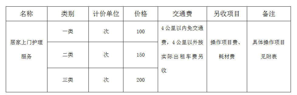 注:居家上门护理服务需要提供两种或两种以上类别服务时,居家上门护理服务费按类别最高价格100%+其他类别价格50%收取,具体操作项目费用及耗材费等另收项目按原价收取。