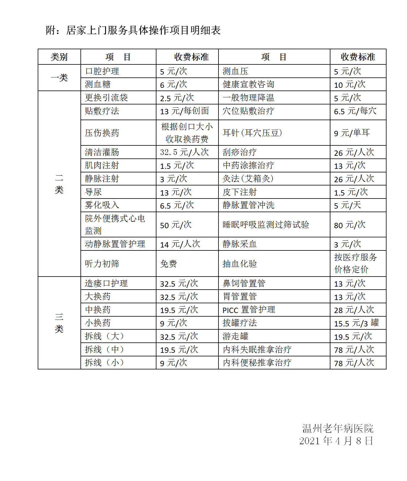 自2021年4月份起,为方便市民,温州老年病医院向广大患者提供居家上门护理服务。居家上门护理服务收费标准如下:
