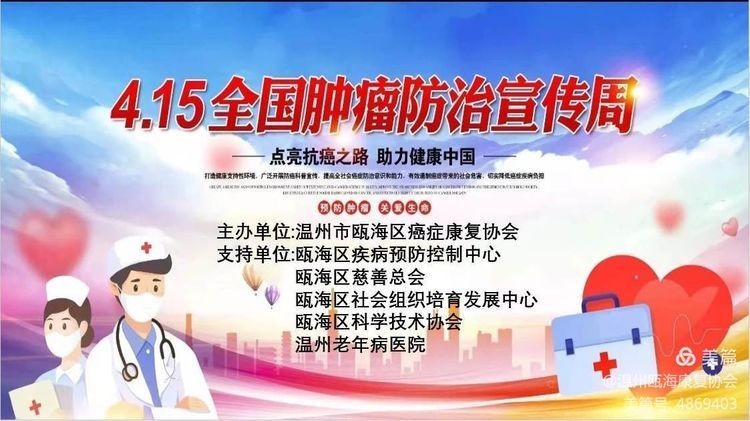 在国家提倡“健康中国”的大环境下,我院联合瓯海癌症康复协会开展了主题为“点亮抗癌之路 助力健康中国”的肿瘤防治宣传周科普活动。旨在普及科学防癌理念,提升公众防癌意识,营造良好的癌症防治社会环境,真正实现全国肿瘤防治宣传周的价值所在。