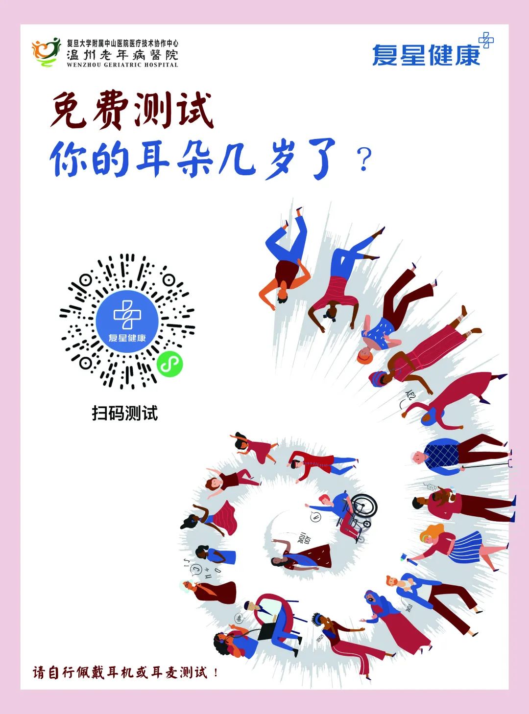 经研究发现,听力下降的人,约70%左右都患有冠心病等心血管疾病。内耳血管对血流很敏感,一旦心血管出问题,会比其他部位更早反映出来。那么怎样判断自己的听力正不正常呢?大家可以微信扫一扫识别下图二维码,来为耳朵做一个小测试。