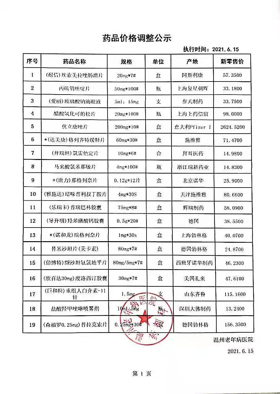 温州老年病医院药品价格调整公示