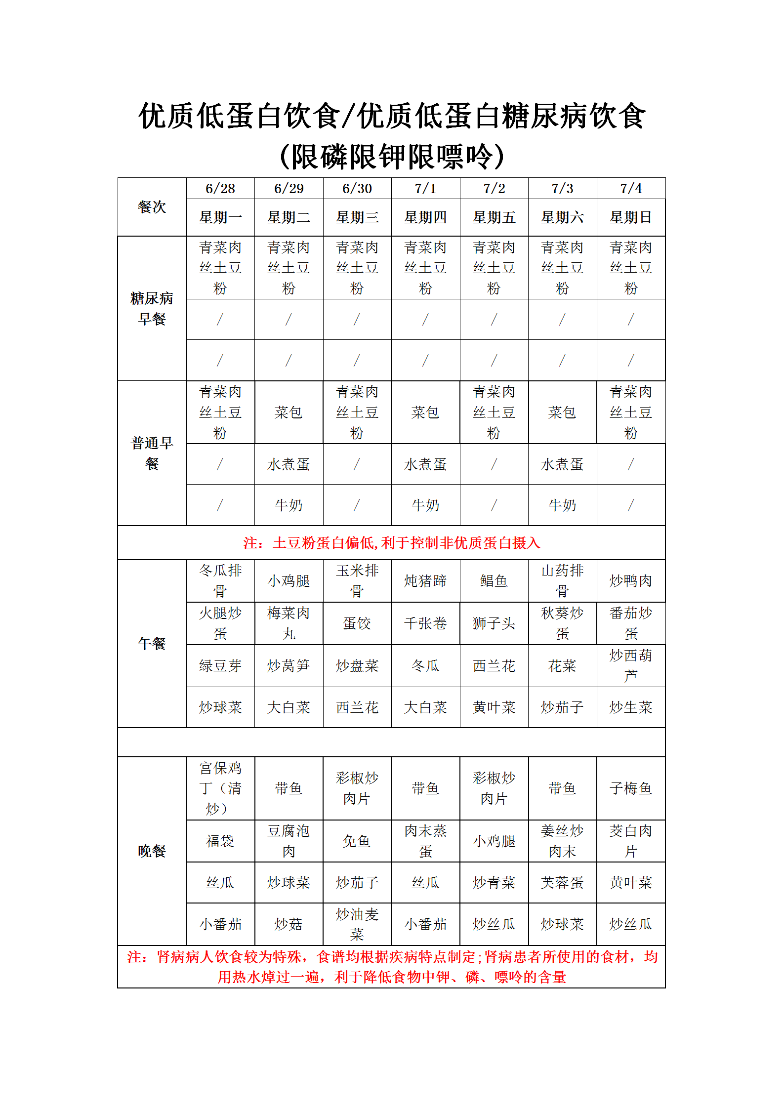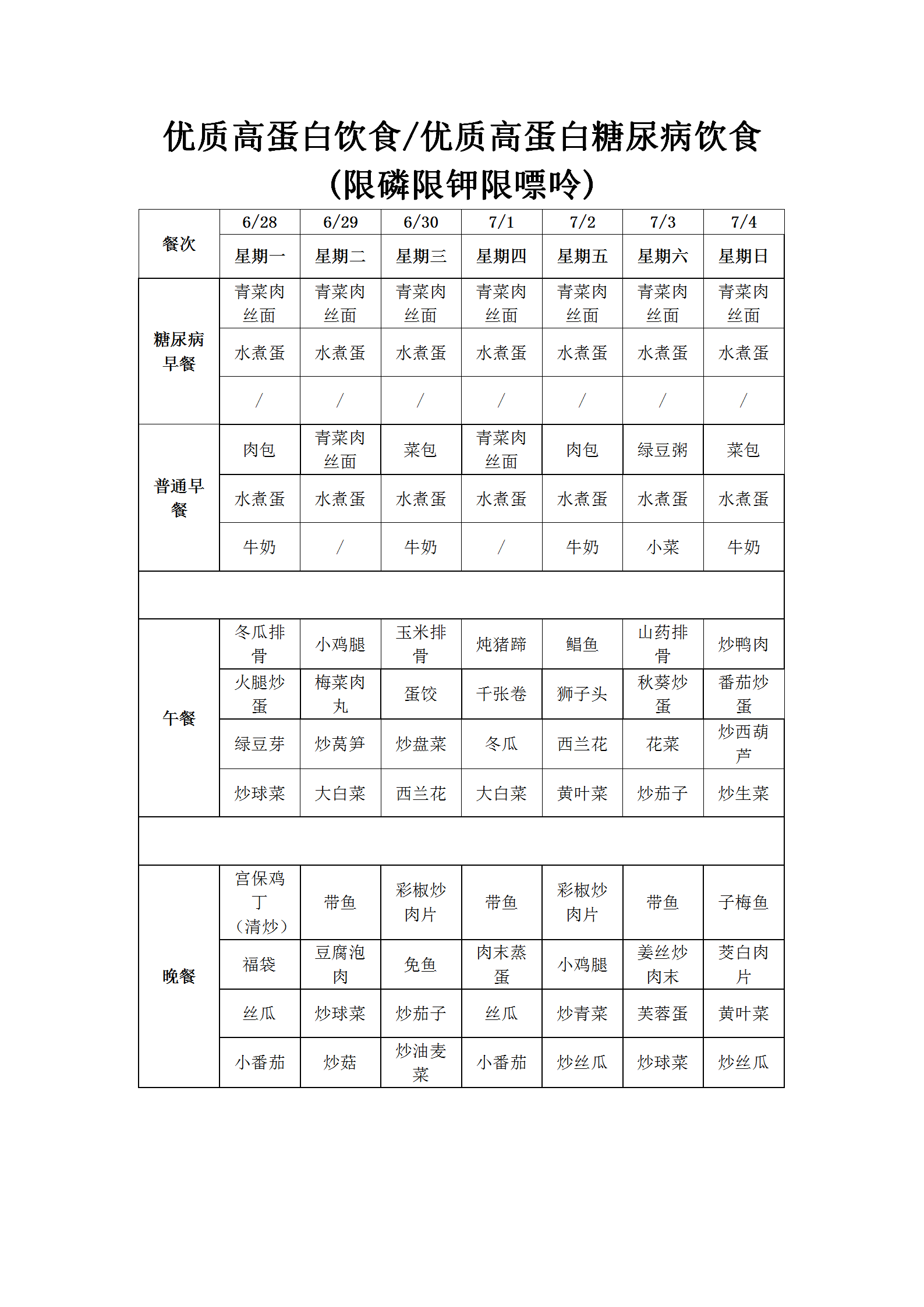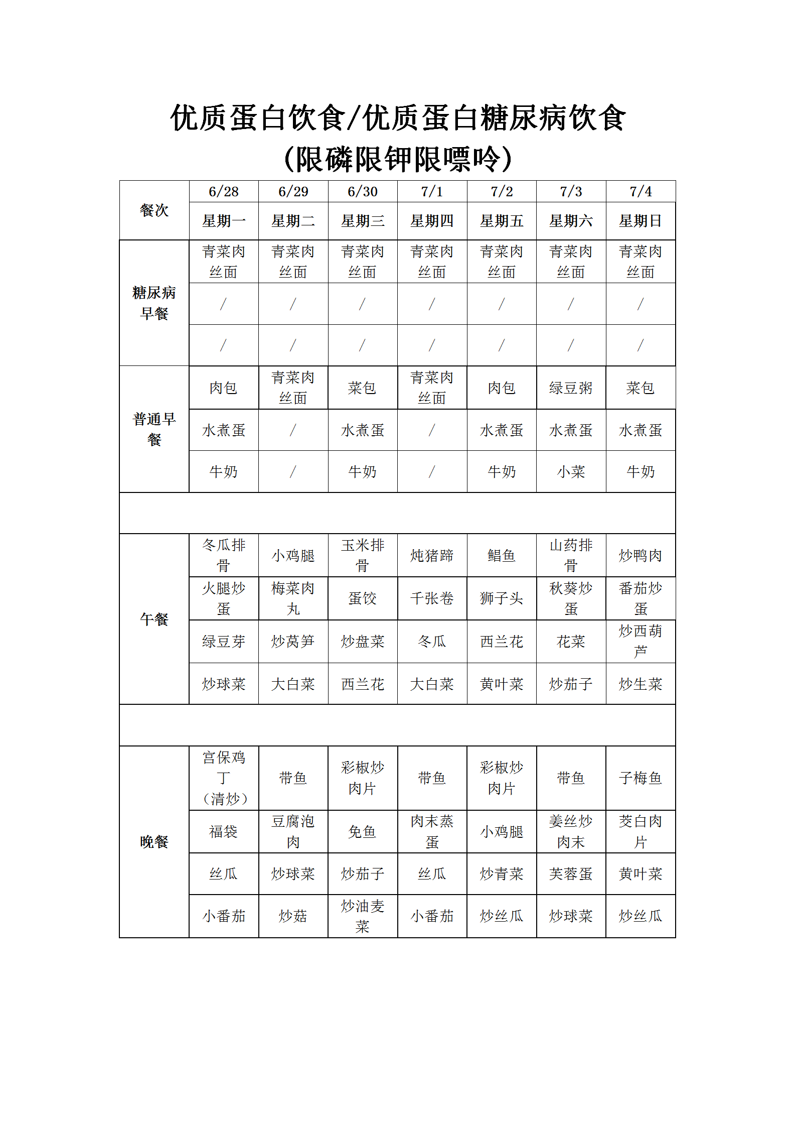 温州老年病医院营养食谱(6月28日-7月4日)