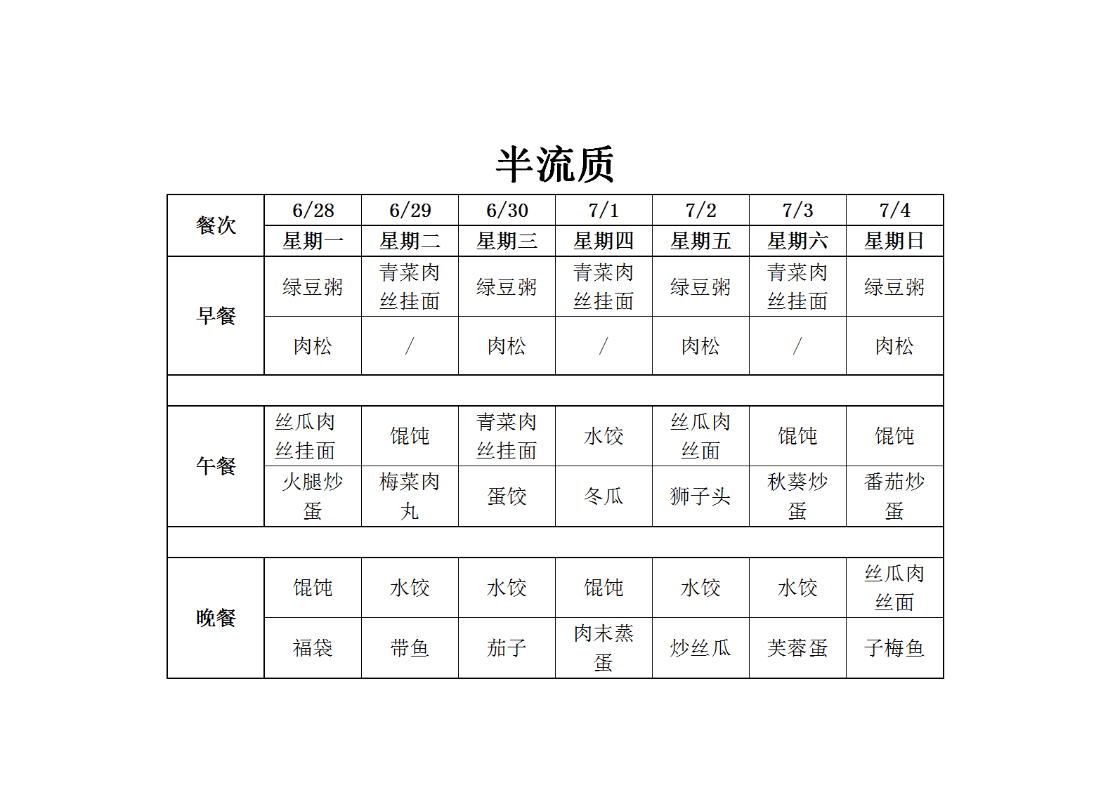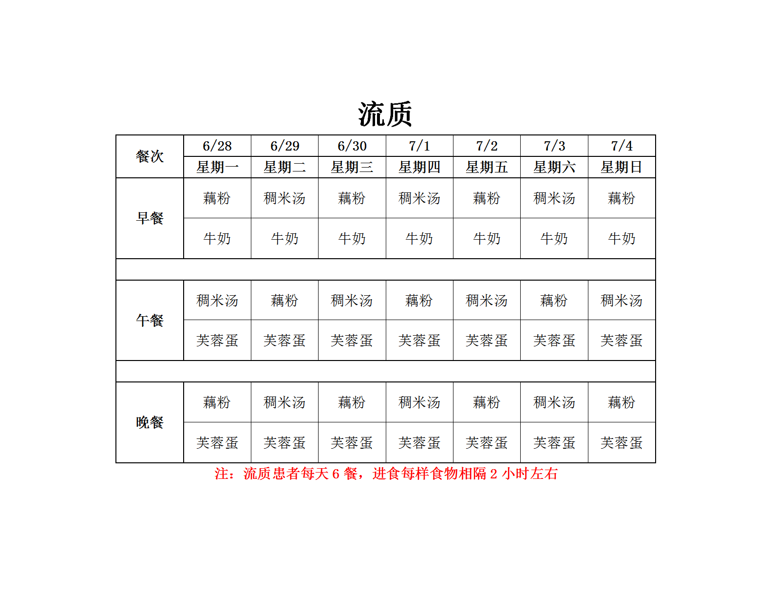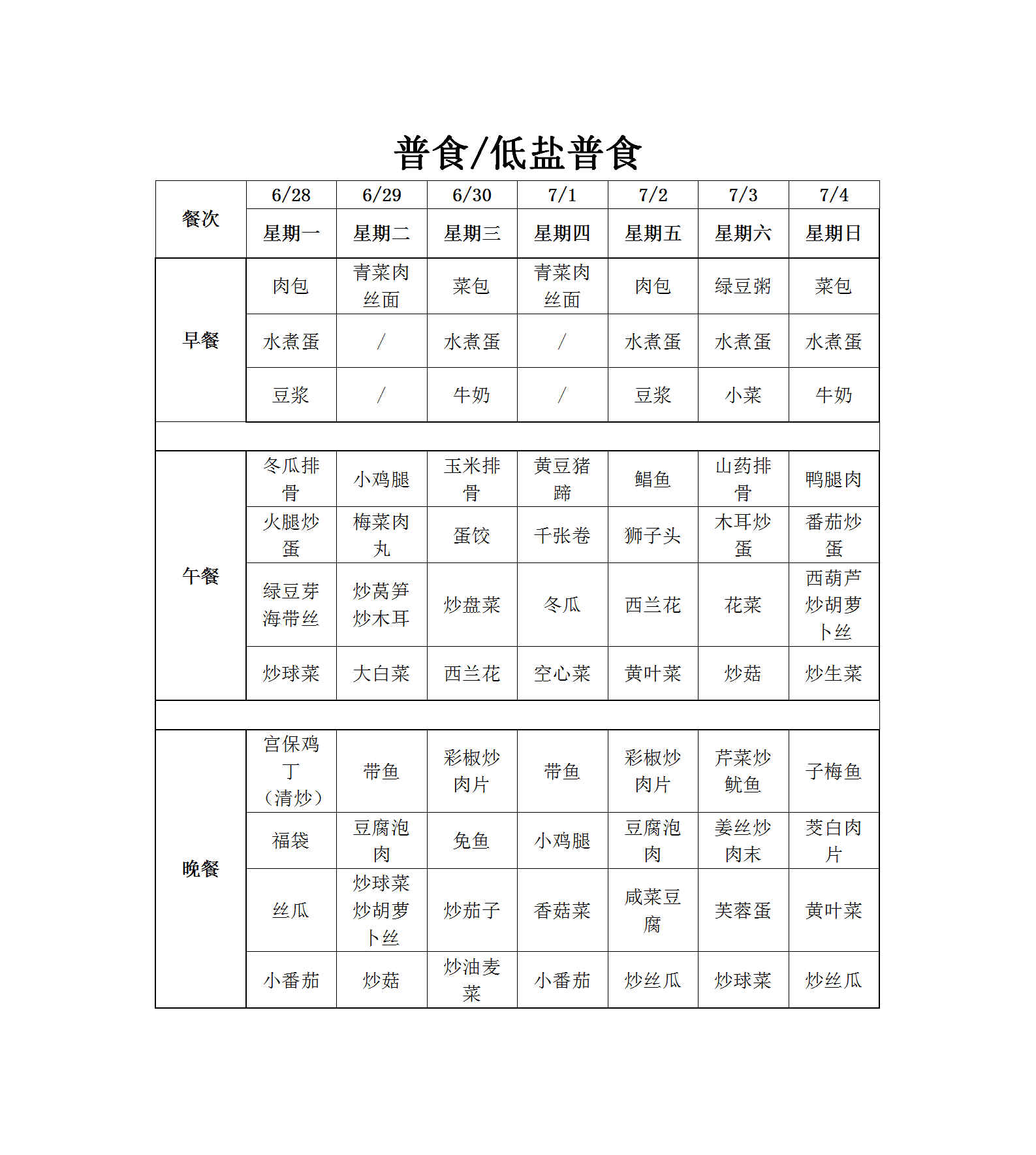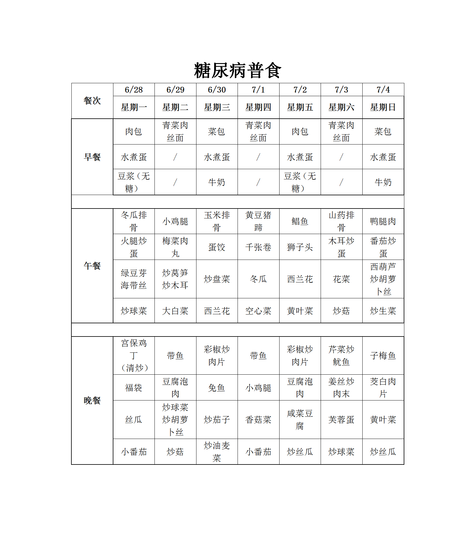 温州老年病医院营养食谱(6月28日-7月4日)