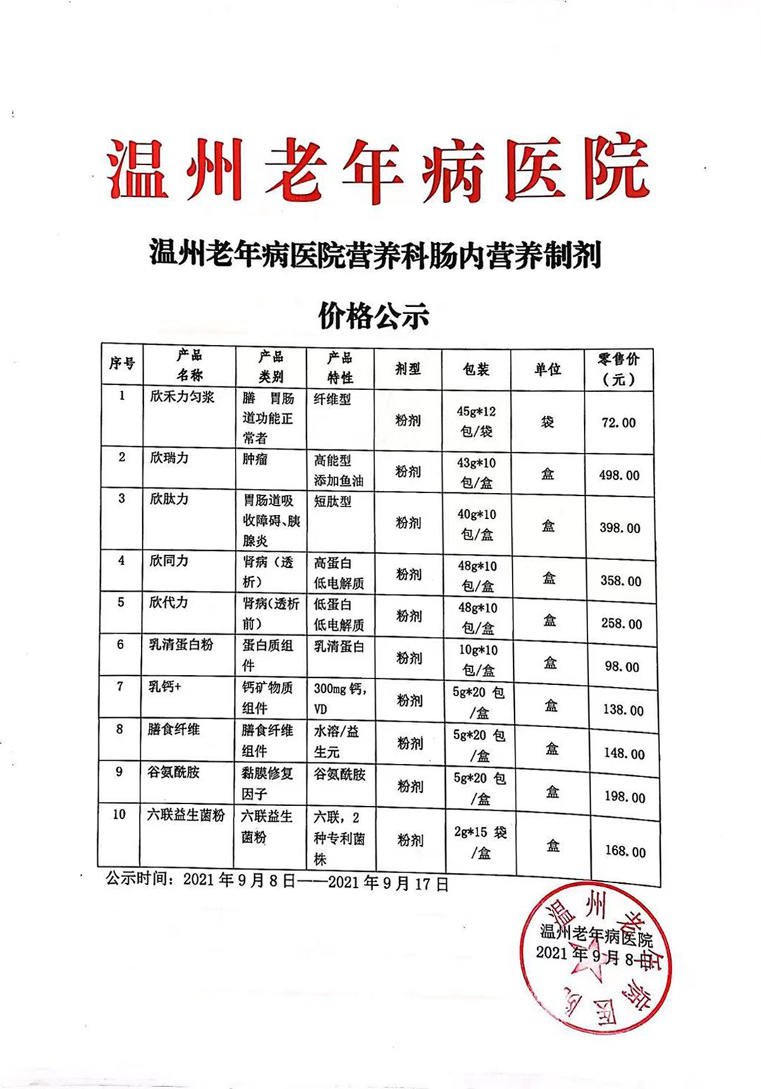 温州老年病医院营养科肠内营养制剂价格公示