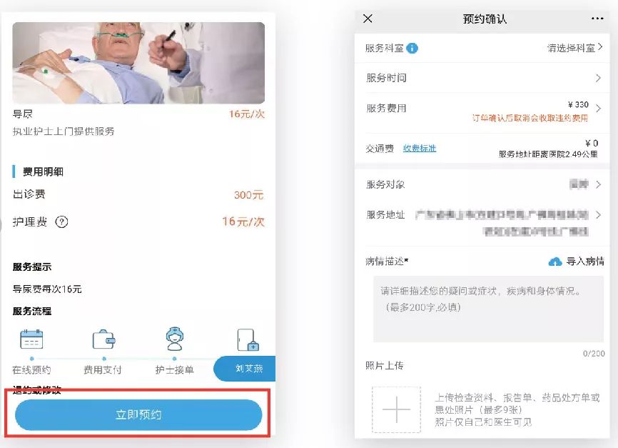 签约后,选择服务项目、上门时间,完成线上支付,等待护士上门。