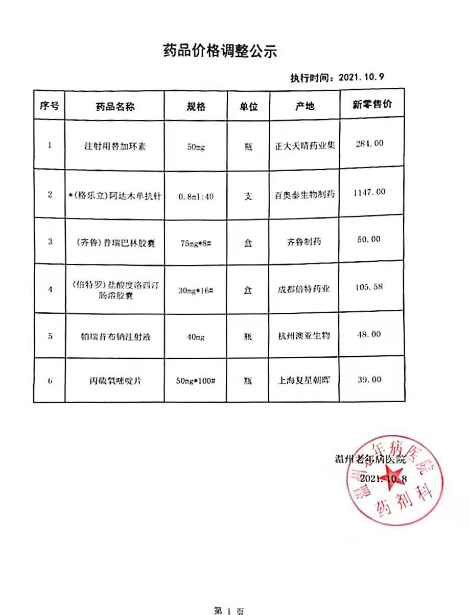 温州老年病医院药品价格调整公示(10月8日)