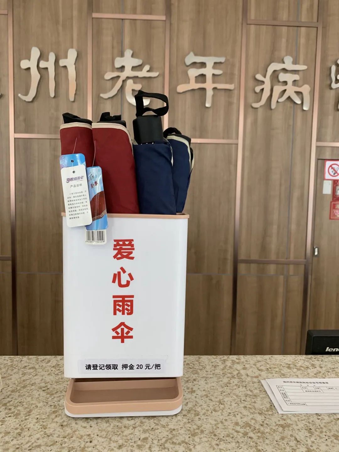 雨天路滑,门诊部同事主动为来院就诊的病人打包雨伞