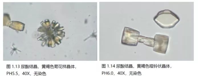 尿酸结晶:为嘌呤代谢产物。在沉渣镜检中呈黄色、暗棕色三菱形、蝴蝶形,尿ph为酸性。一般情况下无临床意义,但大量尿酸沉积在肾小管中,可或产生尿酸结石,痛风患者易见。