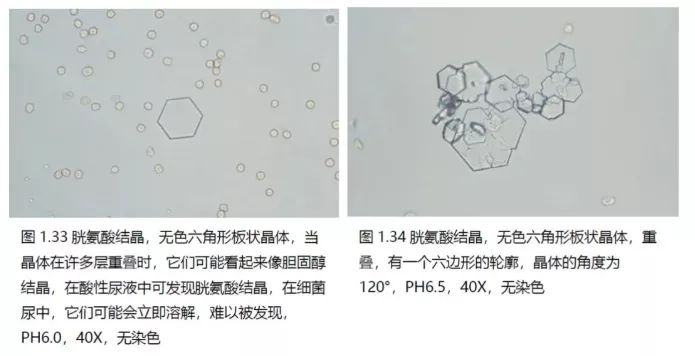 胱氨酸结晶:无色六边形,尿中大量出现多考虑为肾结石或膀胱结石。