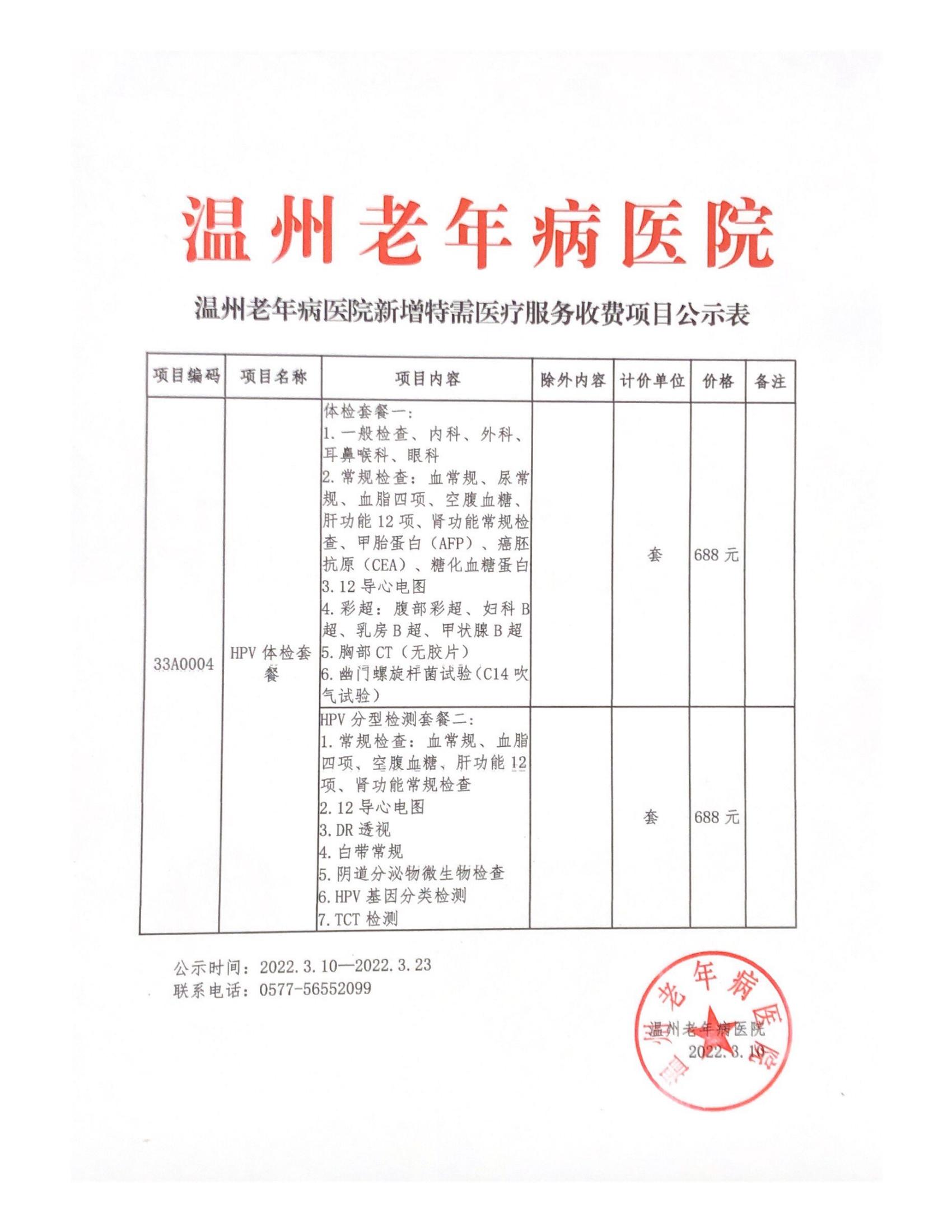 温州老年病医院新增特需医疗服务收费项目公示表