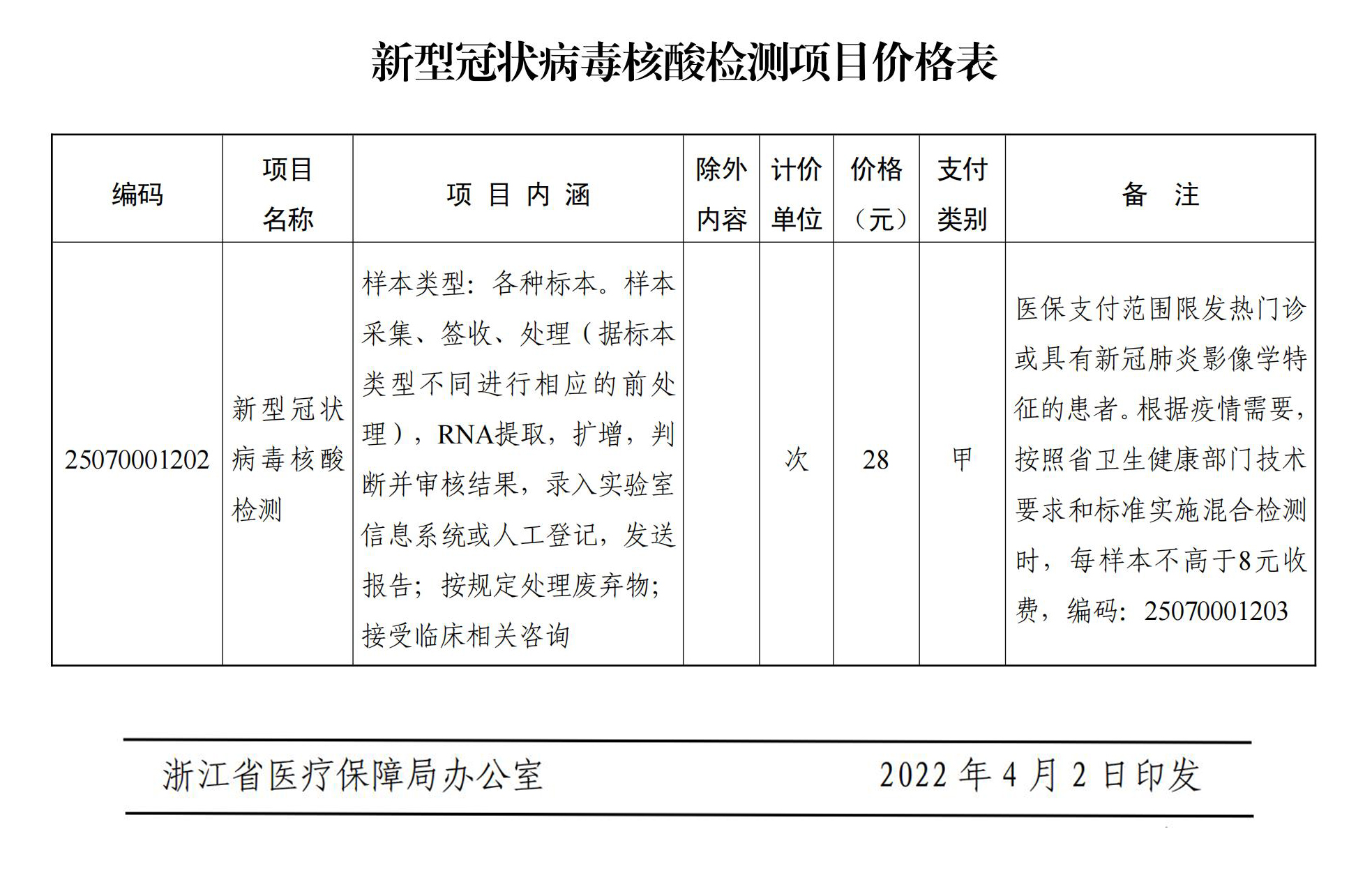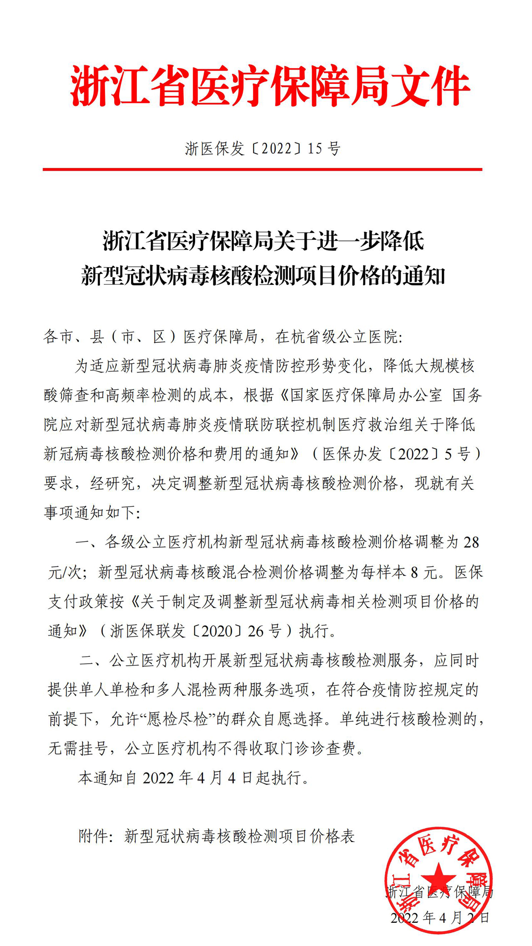 浙江省医疗保障局关于进一步降低新型冠状病毒核酸检测项目价格的通知