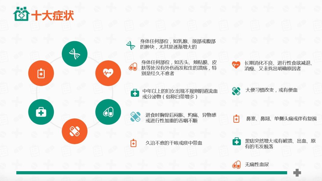 二级预防就是三早预防,即:早期发现,早期诊断,早期治疗。我们每个人都应接受健康教育,提升健康素养,警惕癌症的早期信号。定期有针对性的防癌体检,是早期发现癌症的重要手段。积极治疗体检发现的癌前病变,又可以大大降低癌症的发病率,达到预防癌症的目的。癌症发现越早,治疗效果就越好,生存时间也越长。除了体检之外,我们还要时刻警惕,一旦有以下十大症状,就是癌症危险信号,必须及时就医: