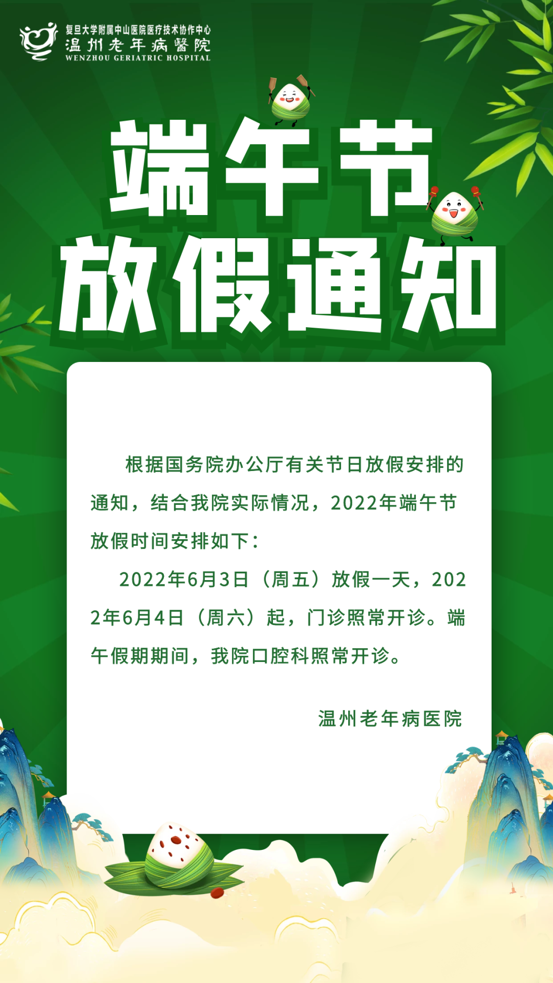 温州老年病医院2022年端午节放假通知