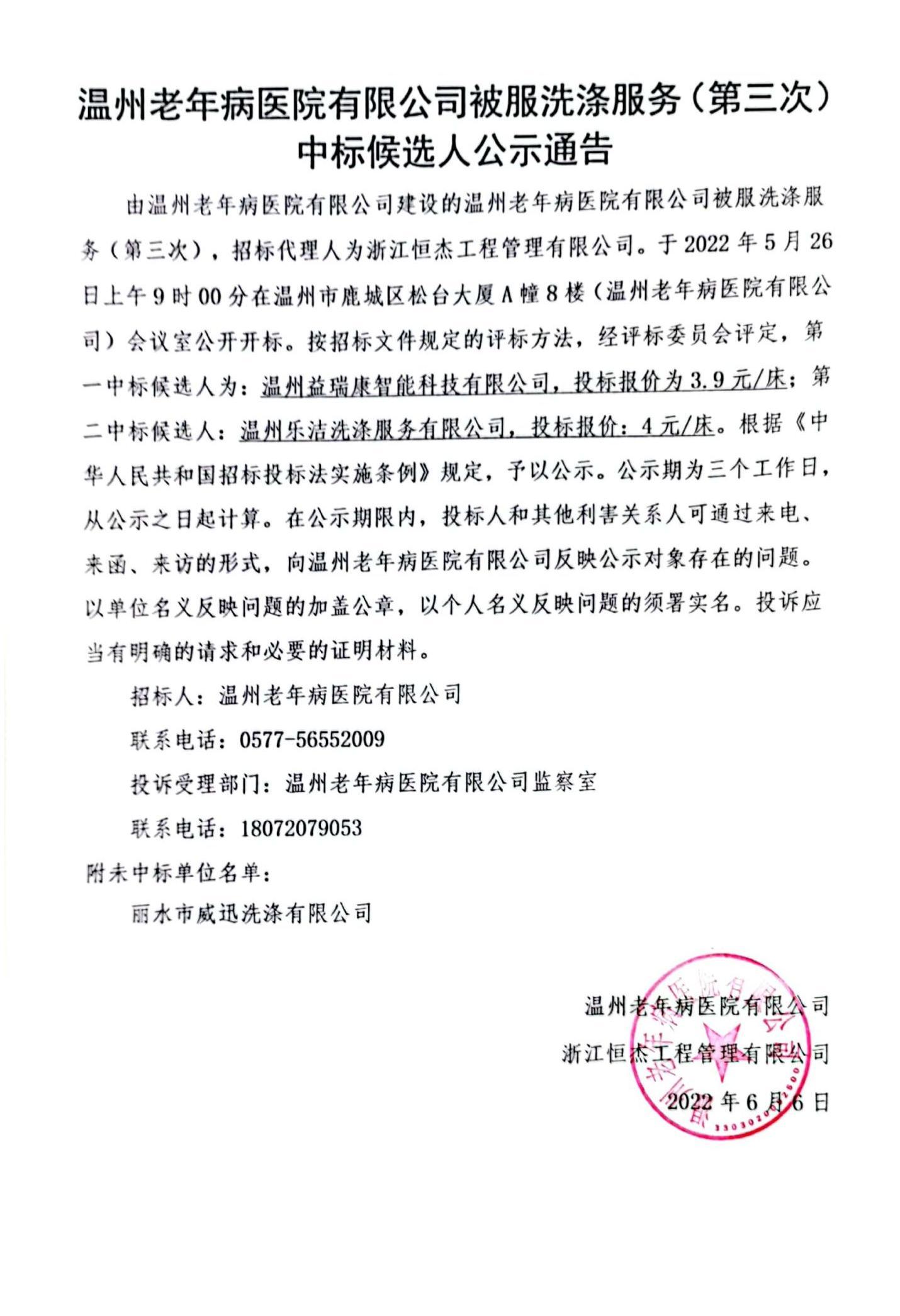 温州老年病医院有限公司被服洗涤服务(第三次)中标候选人公示通告