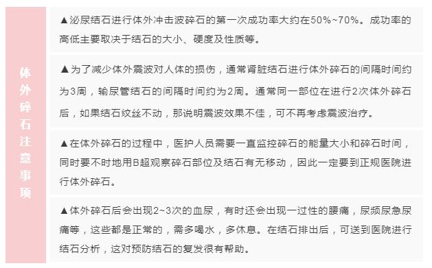 老百姓常说的体外碎石,全称应当是体外冲击波碎石。在碎石的过程中,分子产生激烈震荡,结石发生崩解,从而被击碎。结石打碎成小颗粒后,便会随着尿液经尿道排出体外。