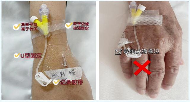▲注意保护留置针留置肢体,不输液时,避免肢体下垂姿势,避免重体力劳动,以免重力作用造成回血堵塞导管;