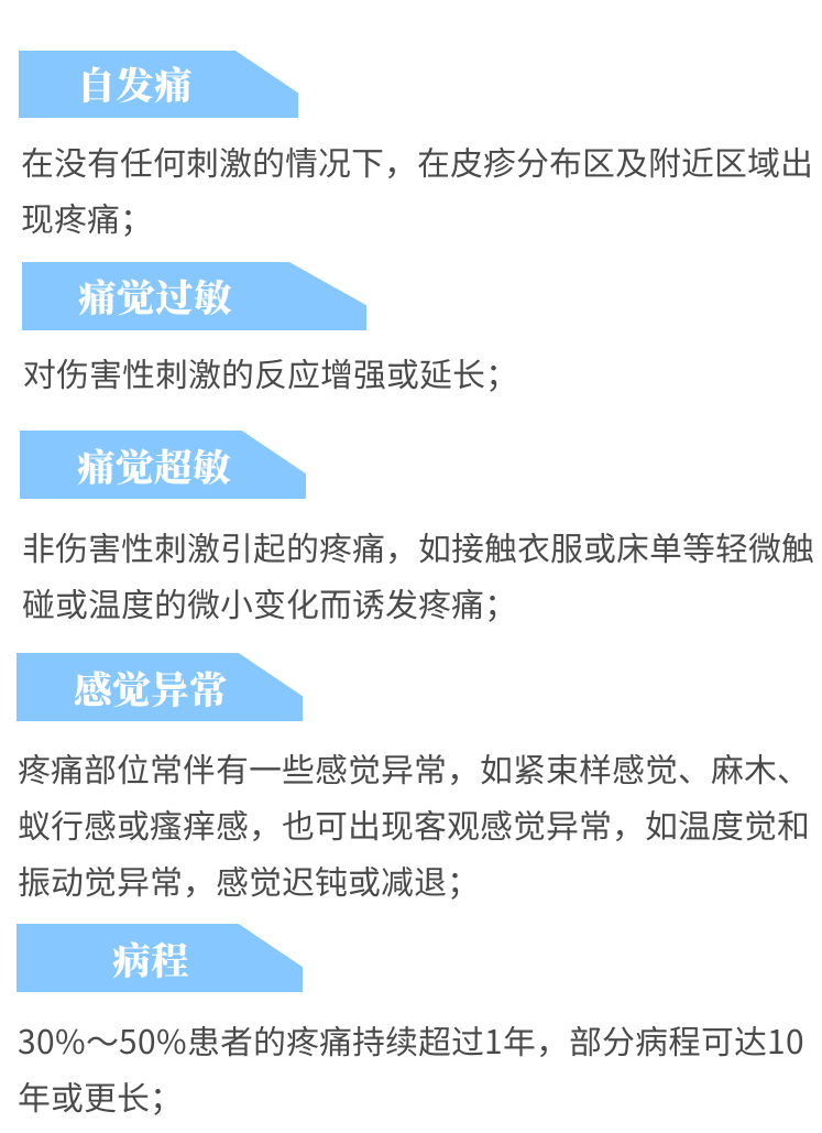 带状疱疹后神经痛是最常见的一种神经病理性疼痛,可表现为持续性疼痛,也可缓解一段时间后再次出现。