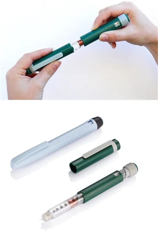 (3)安装针头:取出一个新的针头,打开包装,顺时针旋紧针头,安装完毕。注射时摘去针头保护帽即可。