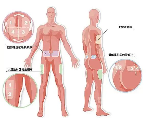 ▲需长期胰岛素注射的患者,要进行有规律的注射部位轮转,以防止同一部位持续注射引起皮下脂肪增生,甚至产生硬结从而影响药物吸收。