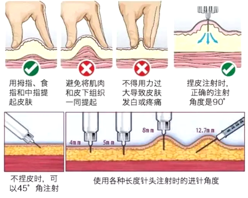 ▲正确的捏皮方法和进针角度