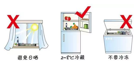 ▲没有开封的胰岛素要放置在2-8℃的条件下保存。因为低于2℃时,胰岛素会出现结晶,失去生物学效应,即使解冻,也不能恢复其生物学效应。开封的胰岛素可以放在室温(25℃)保存,避免潮湿及阳光直射;注明开封时间,务必在4周内用完,超过4周应废弃。