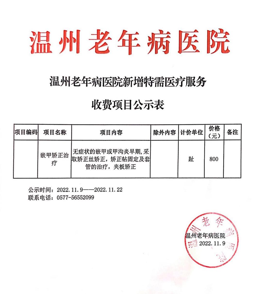 温州老年病医院新增特需医疗服务收费项目公示表