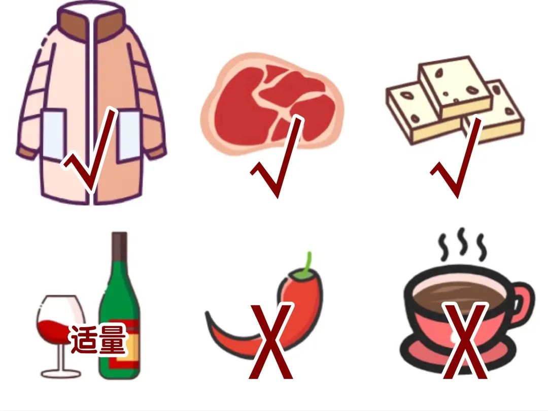 适时增加衣服,避免严寒刺激,特别是寒流袭来,气温骤降时。在饮食上应当多吃一些产热量高和营养丰富、易消化的食物,如瘦肉、鸡、鱼、乳类及豆制品,少吃高脂肪以及刺激性强的食物,如奶油、辣椒、浓茶、咖啡。禁烟,可以适量饮用红酒,多食高纤维素食物,保持大便通畅。