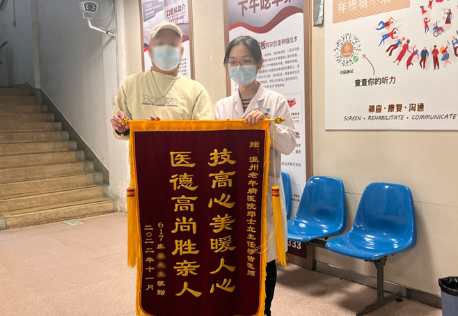 虞先生将两面写有“医德高尚胜亲人,技高心美暖人心”、“精心护理,热情周到”的锦旗递到医护人员手中,他表示,真的很感激针灸推拿科,为他解决了这个棘手的“老毛病”。