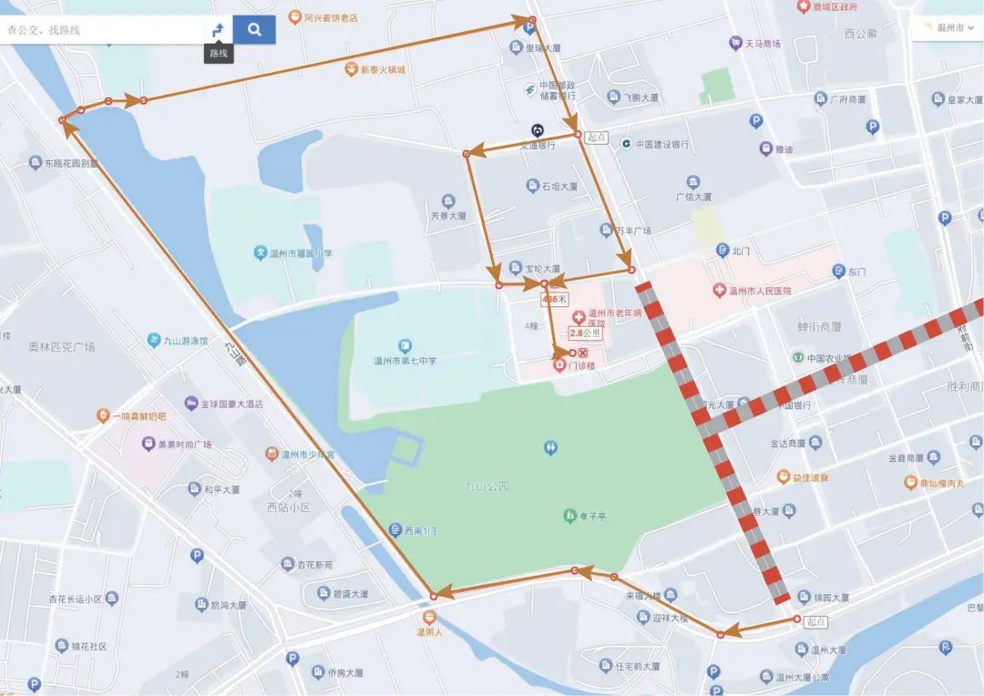 信河街(大士门至人民路段)、禅街、五马街、公园路、环城东路(公园路至瓯江路段)、瓯江路(环城东路至襟江路段)、望海路(商务四路至襟江路段)、商务四路(瓯江路至望海路段)、商务三路(瓯江路至望海路段)。