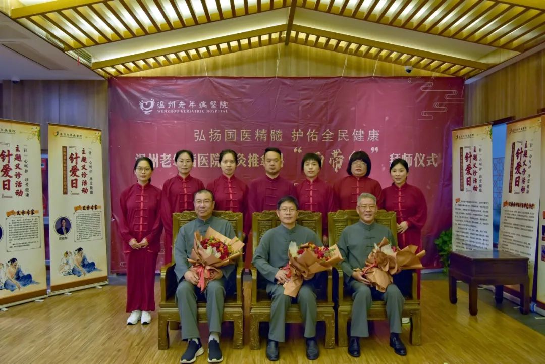 师承岐黄,薪火相传,一场充满中医文化特色的拜师仪式拉开帷幕。省级名中医,省名老中医专家传承工作室建设项目专家,省级名中医传承人项目指导老师,省中医药重点学科带头人郎伯旭主任;国家二级教授,全国老中医药专家学术经验继承工作指导老师,全国基层名老中医药专家傅云其主任;浙江中医药大学兼职教授,中国针灸学会刺络拔罐专业委员会委员,中华中医药学会亚健康分会委员,浙江省针灸学会常务理事,温州市针灸学会副会长,温州市康复医学会针灸康复专业委员会主委郑士立主任3位中医学术传承老师分别与7位年轻的骨干中医师行中医师承拜师仪式,正式建立师徒关系。行拜师礼,敬尊师茶,献拜师花束,青年医生们通过传统仪式隆重地表达对老师的尊重。在接下来的时间,老师们会将自己在长期临床实践中积累的学术经验和技术专长传授给弟子,以促进中医的青蓝相接。