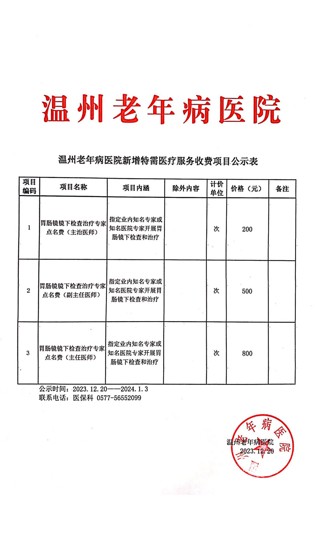 温州老年病医院新增特需医疗服务收费项目公示