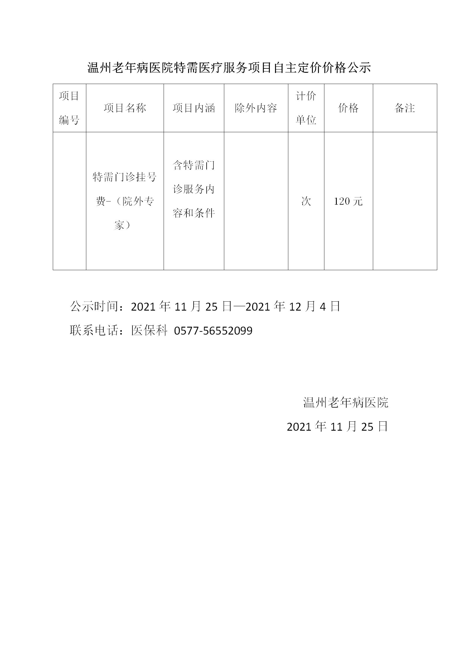 温州老年病医院特需医疗服务项目自主定价价格公示(11月25日)