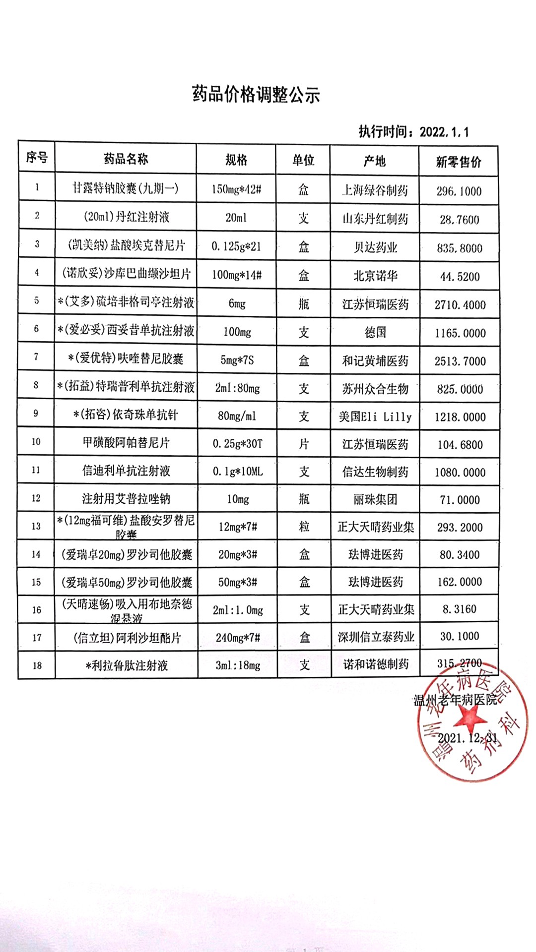 药品价格调整公示