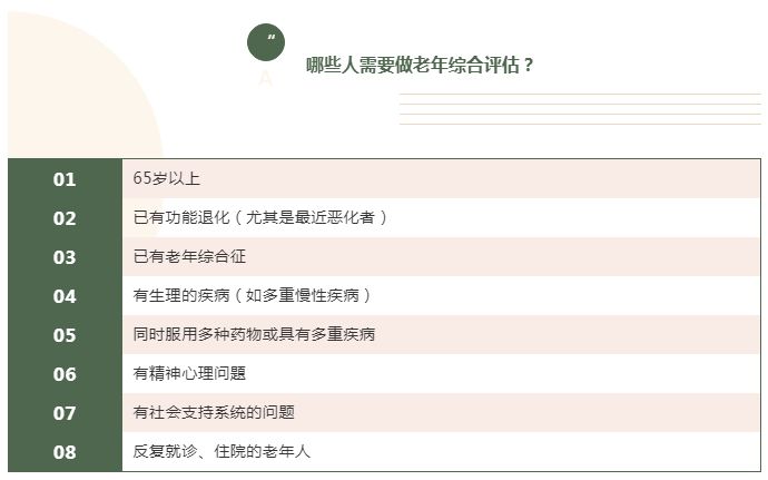 老年综合评估(CGA)是指采用多学科方法从疾病、认知、心理、社会、环境等多个层面对老年人进行全面评估,不同于传统只针对疾病的评价方式,还可以筛查影响老年人疾病预后和增加死亡率的老年综合征。可以说,老年综合评估,就是一张老年人的健康“安心方”。