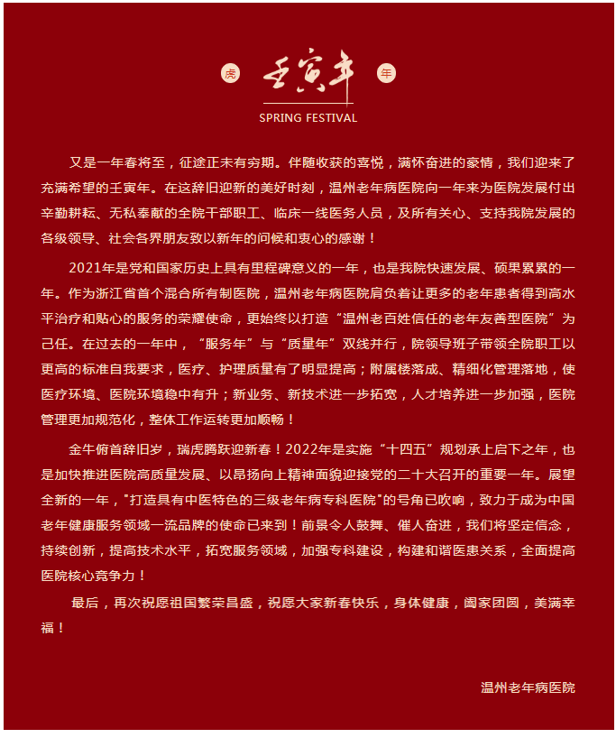 温州老年病医院给您拜年,恭祝全市人民新春快乐,身体健康!