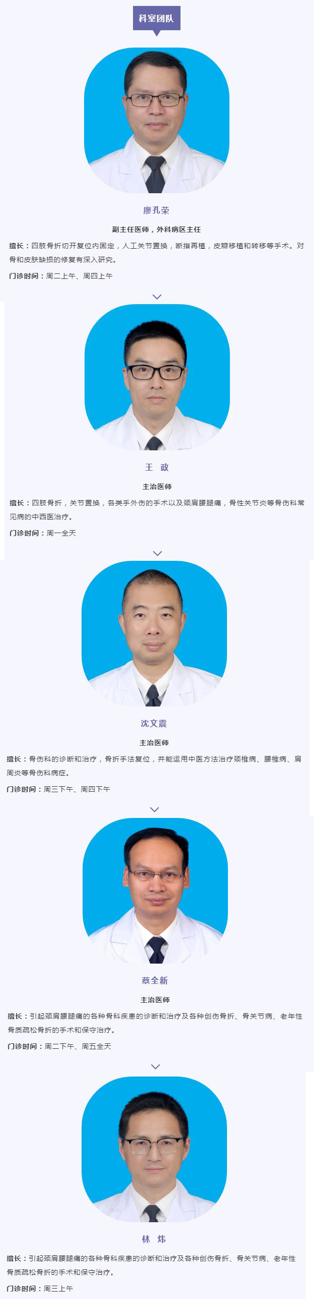 温州老年病医院骨外科于2018年9月5日正式对外开放,开展全身各部位的骨折内固定手术。团队显微外科技术在国内处于领先水平,断指断肢再植成功率达百分之九十以上,尤其擅长皮瓣转移和移植修复创面和骨缺损。在治疗老年人的各类骨折如骨质疏松性骨折、脊柱骨折、股骨颈骨折、股骨粗隆间骨折上经验丰富,擅长膝关节和髋关节的劳损骨质增生、关节置换诊治,是温州市唯一开展膝关节单侧磨损行单髁置换术的外科科室。