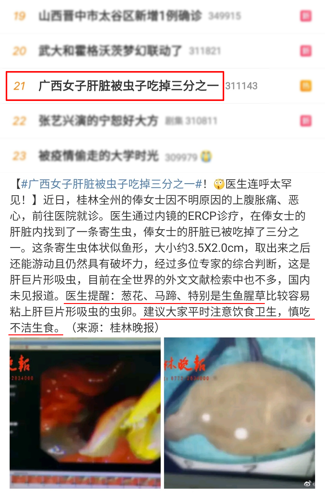 前两天,一则新闻上了热搜: “一女子肝脏被虫子吃掉三分之一!”