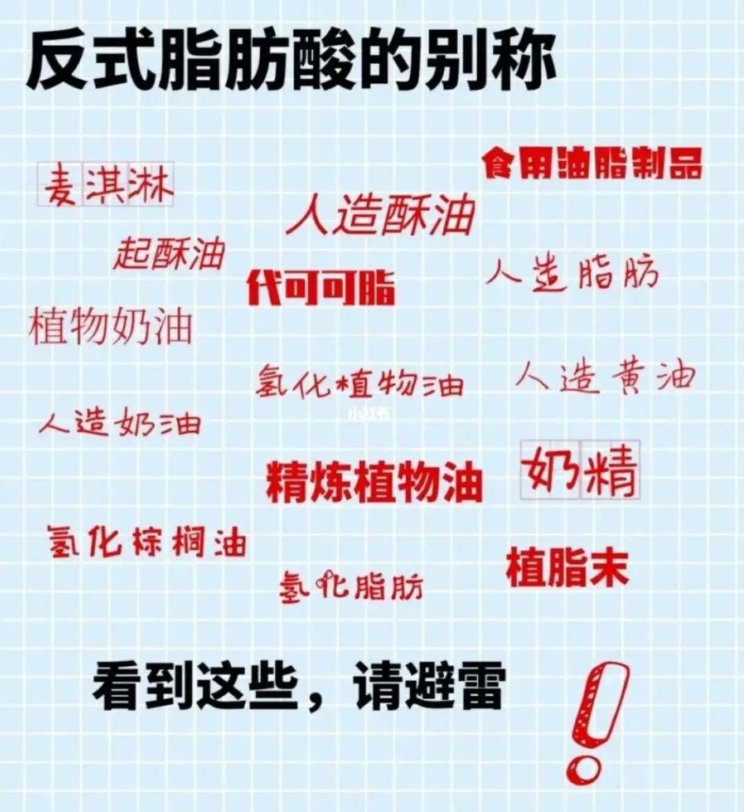 其实当食品中反式脂肪酸含量≤0.3g/100g时,在营养标签上可以表示为“0”,所以要想减少反式脂肪酸的摄入,还是需要一双火眼金睛,看配料表时,注意以下几个成分:植物奶油、人造奶油、起酥油、氢化植物油、精炼植物油、植脂末、代可可脂,这些都是反式脂肪酸。