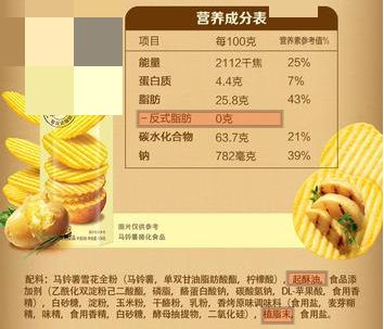 有些包装食品上特意标注“0反式脂肪酸”,那它真的就不含反式脂肪酸了吗?来看这张薯片配料表: