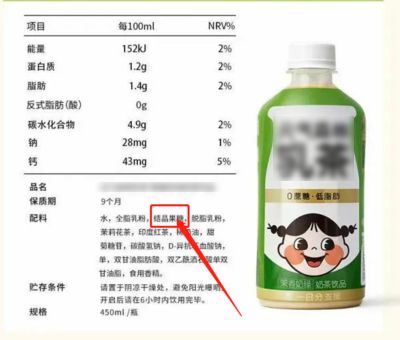 ▲标注“0蔗糖”的饮品,配料表中含结晶果糖