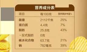 成分表中第三列的营养素参考值的百分比表示的是:每100g食物中各类营养素占你全天推荐摄入量的百分比,例如你吃了100g的薯片,那么你今天所需能量的25%就够了。如果营养素参考值百分比显示120%,则表示你吃了100g这个食品,那么你摄入的这个营养素就超过了每日推荐量的20%。
