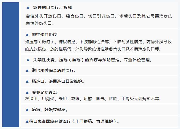 温州老年病医院创面修复科以糖尿病足、压力性损伤、血管性溃疡、癌性溃疡、放射性溃疡、药物性皮肤溃疡、结核性溃疡、特殊细菌感染性创面、痛风石创面、瘢痕溃疡、外科手术后难愈性伤口、腔洞性溃疡、自身免疫性疾病皮肤溃疡等慢性难愈性创面及各种急性伤口引起的皮肤组织缺损为治疗目标。科室拥有一支技术力量雄厚的MDT治疗团队,由多名多学科医护专家组成,其中技术顾问主任医师2名,副主任医师3名,主治医师2名,创面治疗师7人,足病治疗师2人,目前可开放床位50张。创面修复科诊治范围