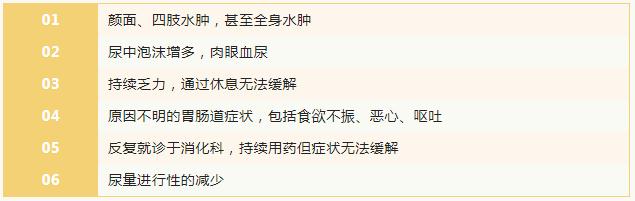 肾脏病在临床上表现各不相同,但是特异性都不强,无法根据一个症状去确诊肾脏相关疾病。如果你出现了以下症状,也需要关注你的肾是否出现了潜在损伤: