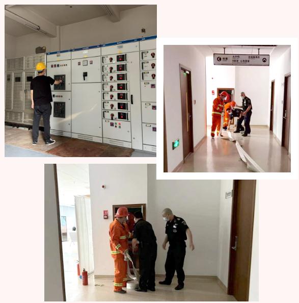 此时,维修组人员马上抵达门诊总配电房切断电源,救火一组穿戴装备完毕抵达门诊配电间,铺展消防水带、安装水栓接口、打开消防水栓阀门。待火情控制后,救火二组前往现场协助一组人员检查安全隐患。