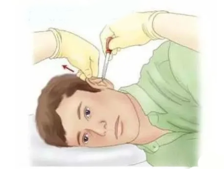 ▲外耳道口向上,牵拉耳郭, 将外耳道拉直,这样可以使药液沿外耳道缓缓流入耳内进行药浴。