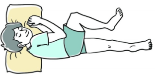▲躺卧后把靠下方的腿伸直,而上方的腿则往胃部方向前弯。