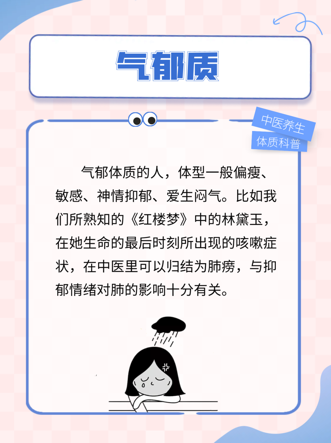 ▲气郁质:行气通气 。少吃补气的食物或酸性收敛的食物,如南瓜、乌梅等。适当多食行气食物,如橘红、陈皮、洋葱等。
