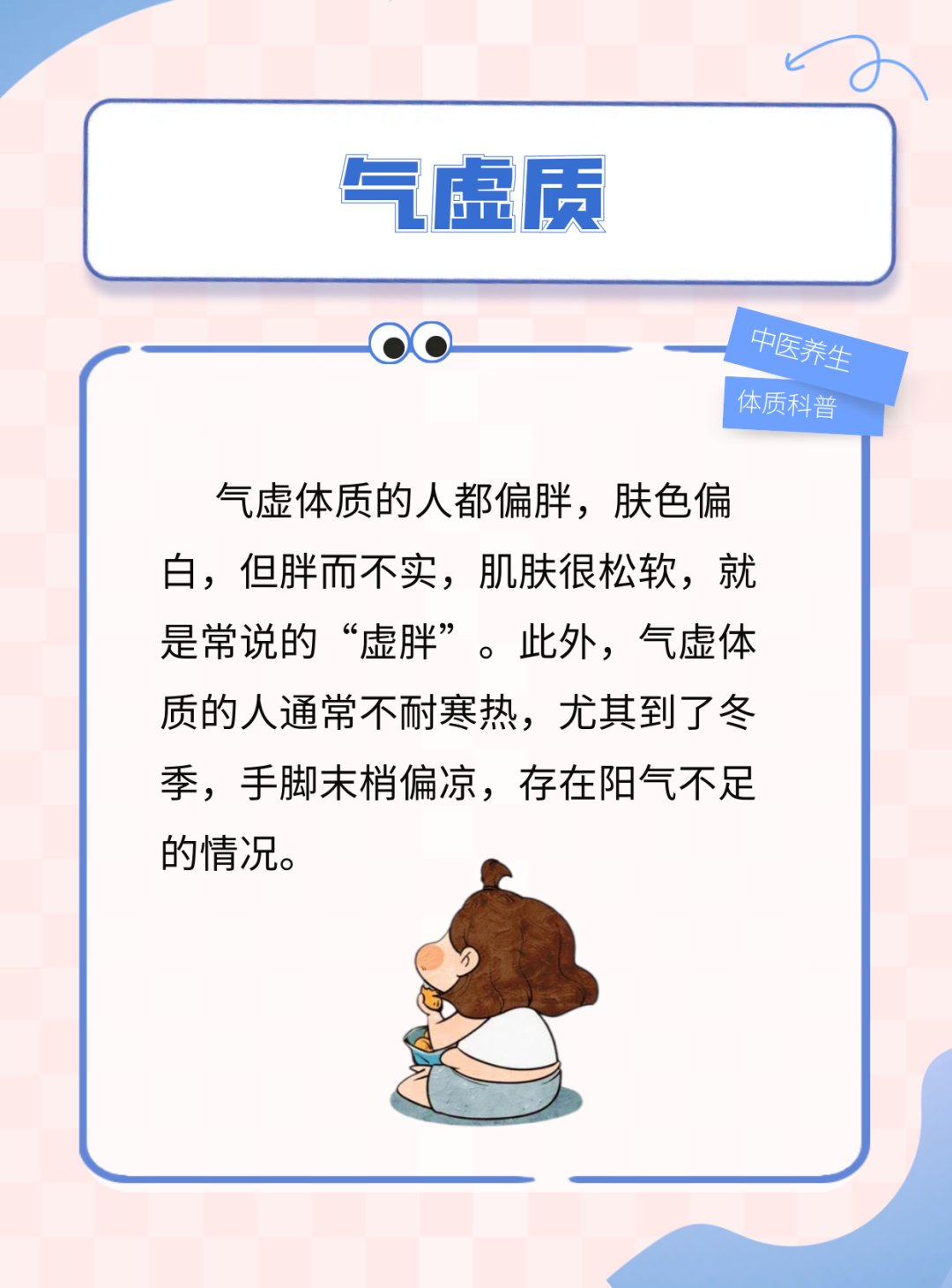 在中医学的9种体质中,最健康的是平和质。这类人体形匀称、肤色润泽、目光有神、精力充沛,有很好的自我调节能力和情绪掌控能力,环境适应能力较强。而其他8种(气虚质、阳虚质、阴虚质、痰湿质、湿热质、气郁质、血瘀质、特禀质)则多属于偏颇体质,需要进行相应的调理才能保持身体健康。下面我们就来例举一下某几种体质的典型表现。